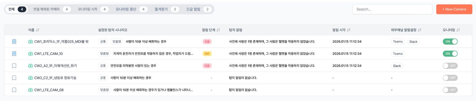 메인 화면은 운영자가 가장 자주 마주하는 공간입니다. v2.6에서는 실제 운영 흐름을 기준으로 리스트 구성을 재정비했습니다. 모델명·탐지 대상과 같이 즉각적인 판단에 기여도가 낮은 정보는 제거하고, 대신 알림 심각도, 최근 알림 요약, 탐지 시나리오 요약, 웹훅 설정 여부와 같은 운영 중심 정보로 컬럼을 재구성했습니다. 이를 통해 운영자는 “지금 어떤 상황이 발생했고, 무엇을 해야 하는지”를 한눈에 파악하고 빠르게 대응할 수 있습니다.