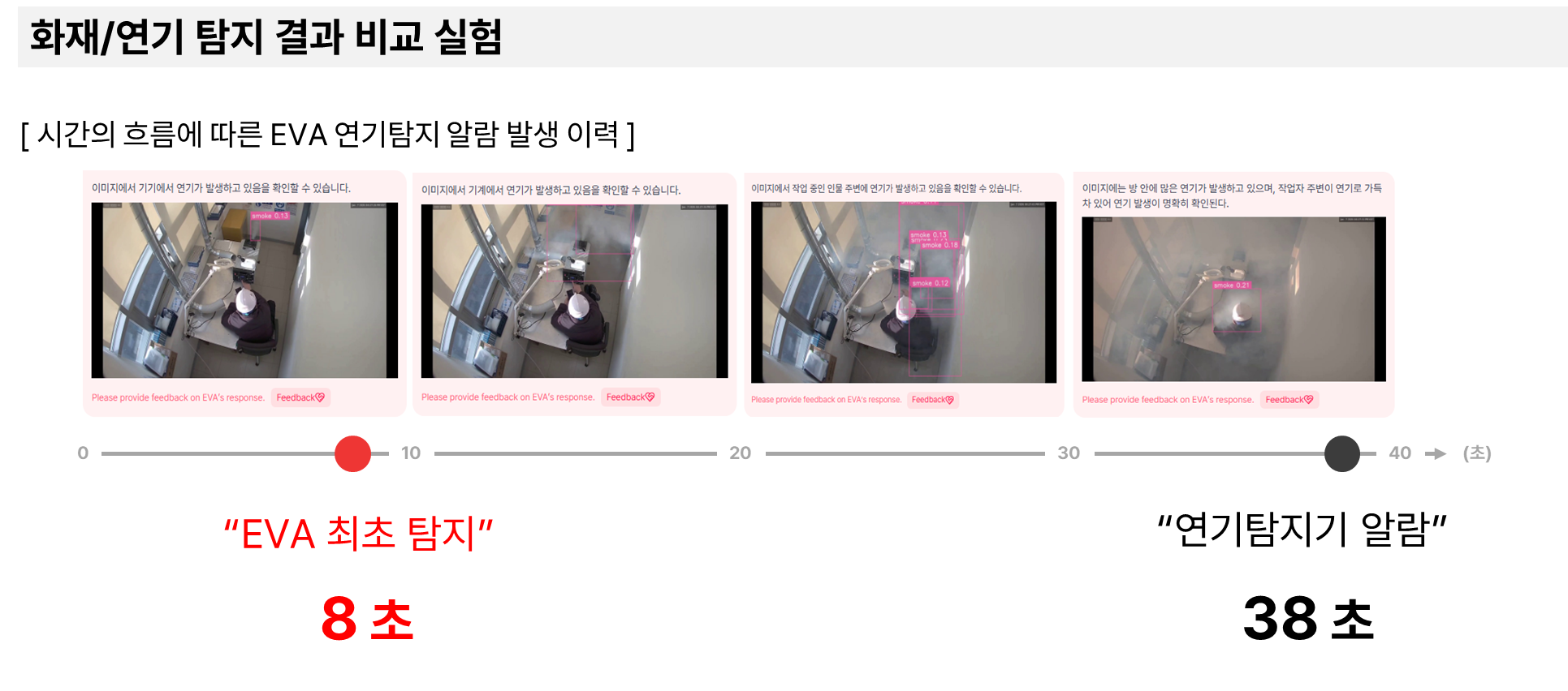 EVA, on the other hand, captures visual changes instantly. Even before smoke reaches the ceiling, EVA analyzes subtle movements and color variations of early-stage smoke in real time to assess potential risk. During this test, EVA responded immediately at the very early stage of smoke generation and issued alerts without waiting for physical diffusion, clearly demonstrating superior detection efficiency.