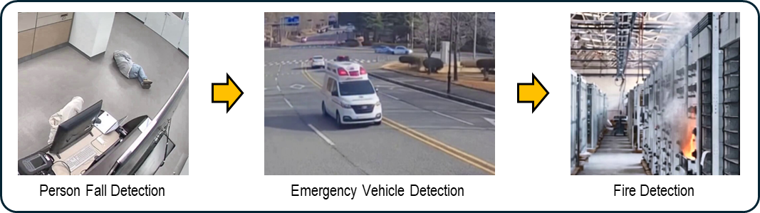[Initial Approach: Unified Query] "Look at this CCTV footage and check whether there is a fire, a fallen person, a traffic accident, or an emergency vehicle entering."