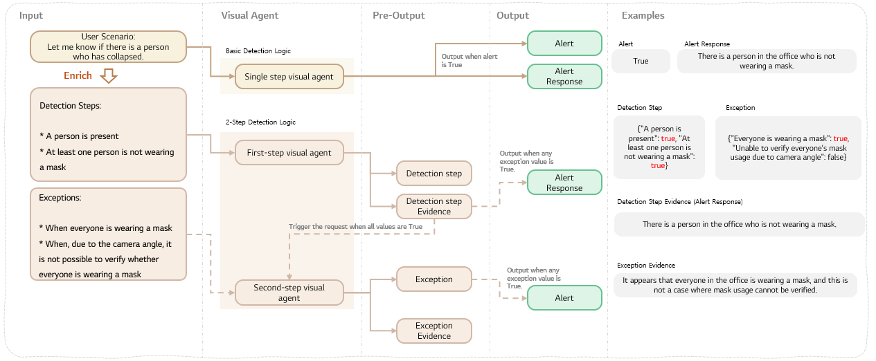 The process of AI making a decision from a single camera image is more complex than most people think. Users may simply ask: “Notify me if someone falls down,” “Alert me when a worker isn’t wearing a mask,” But the AI has to: analyze the image, check the requested conditions, consider exceptions, make the final decision, and explain the reasoning — all in a single pass.